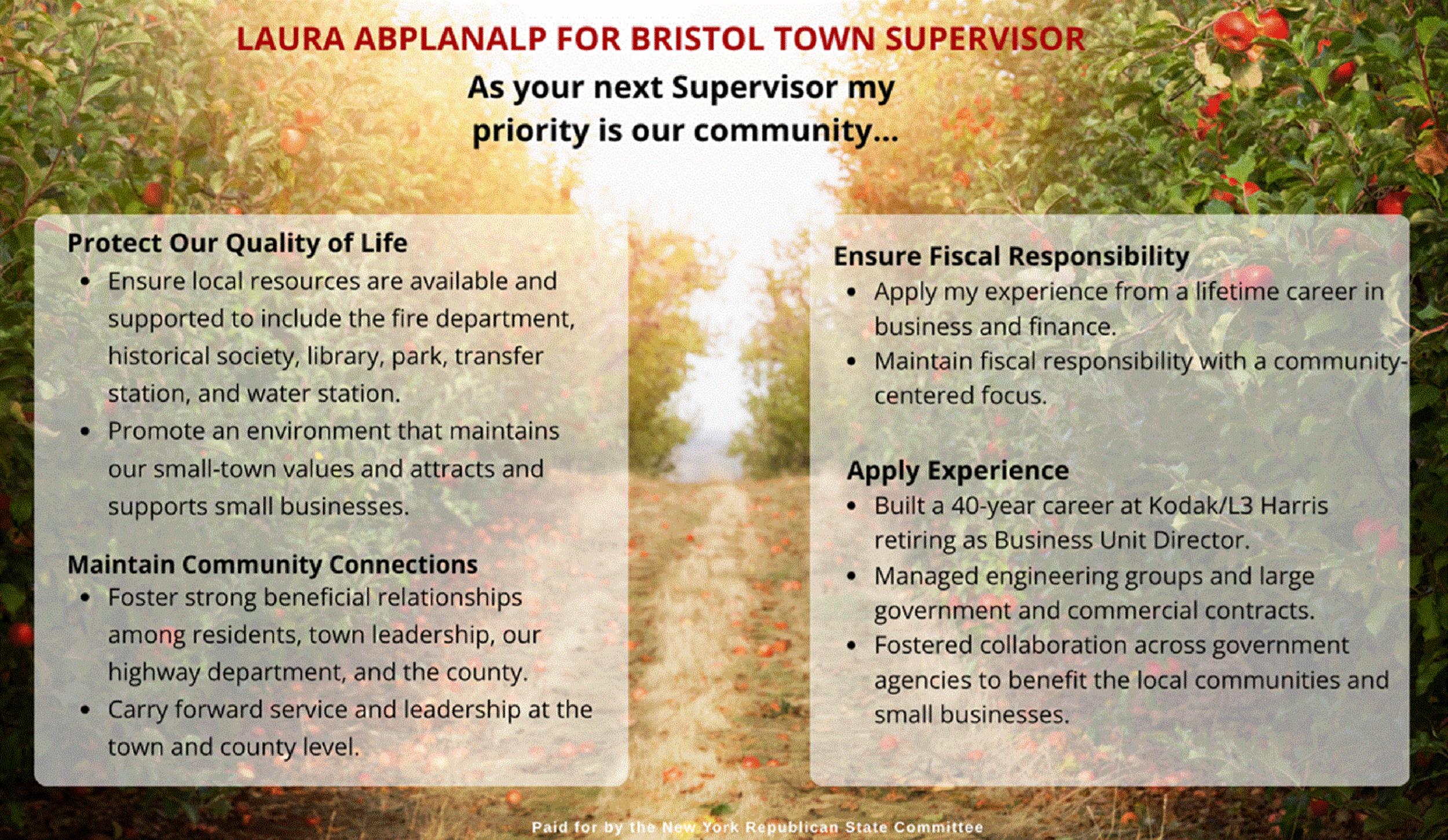 Laura Abplanalp is the Republican and Conservative party endorsed candidate for Supervisor for the Town of Bristol NY. Laura offers the resident of Bristol over 40 years of executive and engineering experience leading complex space, defense, and technology programs with companies like L3Harris, ITT, and Eastman Kodak. She has managed multi-million-dollar projects for NASA and the Department of Defense, led large technical teams, and turned around high-stakes government programs with precision and integrity.